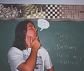 ![]() This my best friend since 2nd grade, Nathan. He's without a doubt one of the more "interesting" people you'll ever meet. Background: Nathan and I met in second grade when I stole his star chart. I didn't know how to use it back then so I used it for a frisbee. He got pissed and I agreed to trade it back to him for a magnifying box (which I quickly broke). |